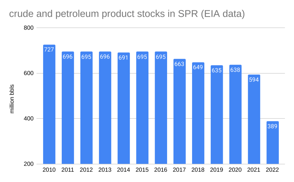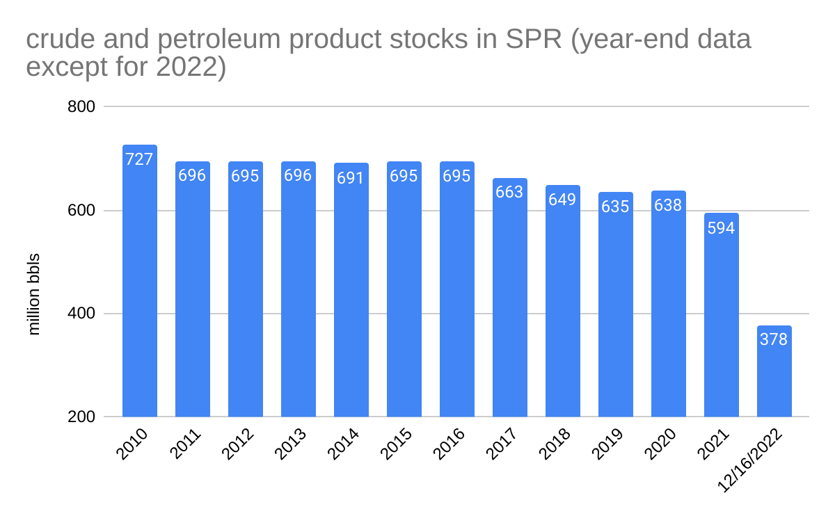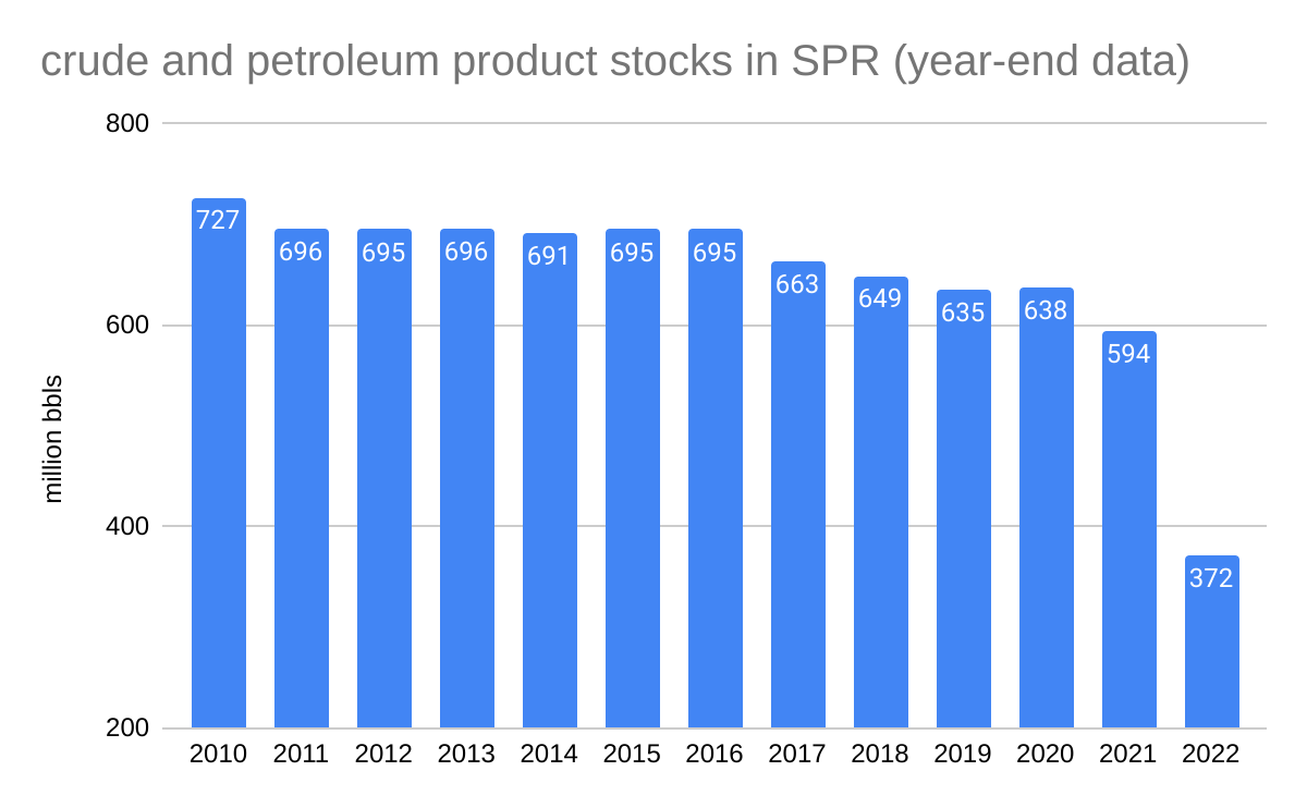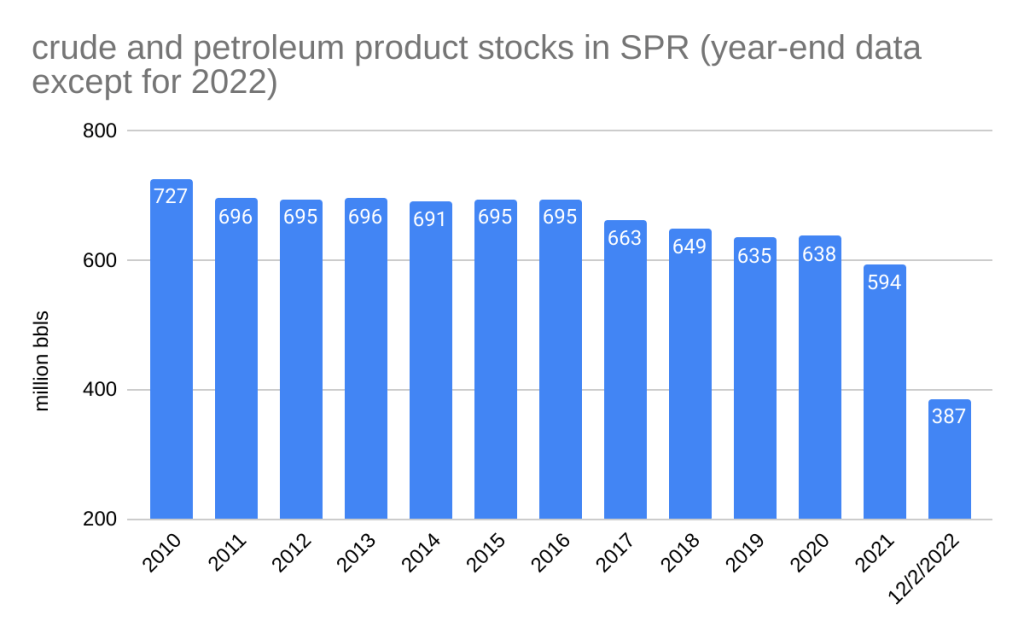 For the first time in 71 weeks the Strategic Petroleum Reserve has not declined. DOE reports that the SPR was unchanged during the week ending 1/20/2023. The reserve remains at 371.6 million bbls, about 51% of capacity.