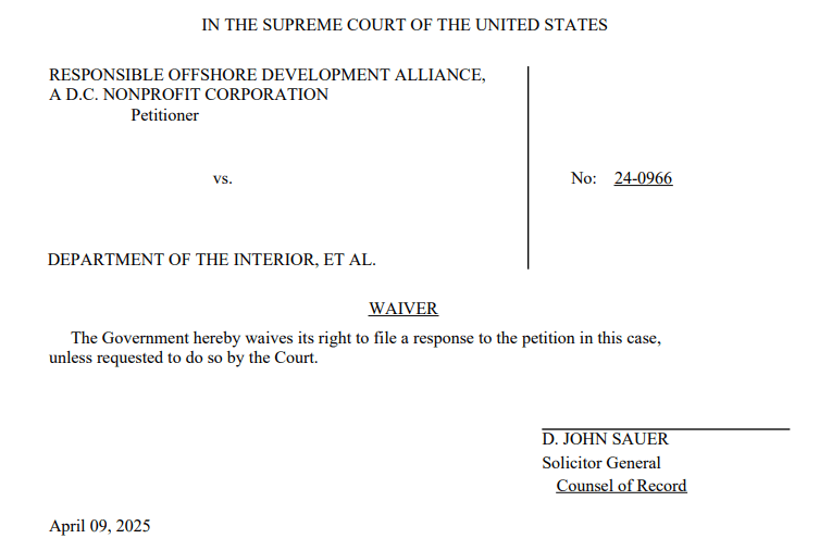 Given that the SCOTUS declined to hear a Vineyard Wind challenge by the Nantucket-based ACK for Whales group, the odds of the new challenges being heard would seem to be low. However, it’s noteworthy that both Vineyard Wind and the Federal Government have waived their right to respond to these petitions. The Government’s waiver to respond to the RODA petition is pasted below.