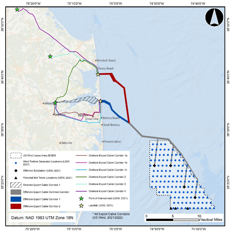A new court filing (attached) informs that the Dept. of the Interior is reconsidering the Construction & Operations Plan (COP) approval for US Wind’s Maryland Offshore Wind (“MarWin”) Project (maps above). That approval is the subject of litigation filed by Ocean City MD and others.