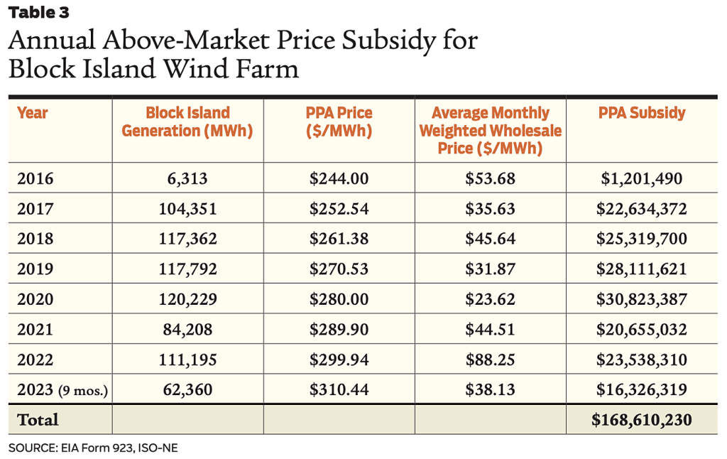 Block Island Wind Farm – “America’s Starting Five” (first 5 offshore turbines) – reliably generates subsidies (table below).