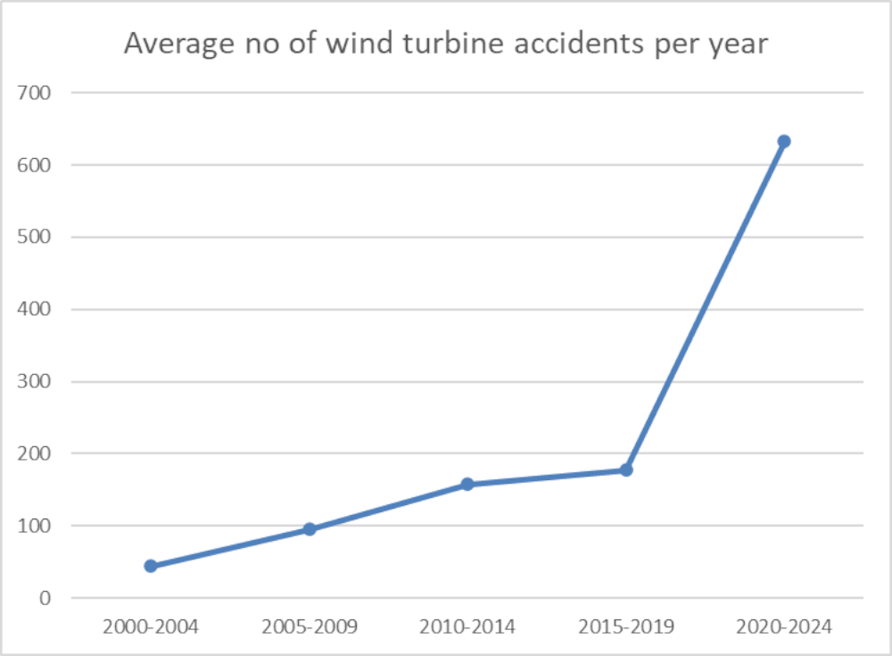 The SAS data indicate that the number of wind turbine incidents has risen sharply in recent years (see chart below). The increased number of turbines worldwide, and perhaps better news coverage of incidents, presumably contributed to the sharp increase. Nonetheless, the growing number of incidents is disconcerting, as is the absence of industry and government summaries and reports.